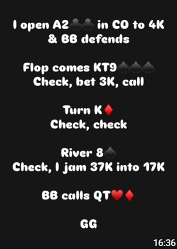 On the second buy-in, I lost a big hand with A9<T9 on 87654♥️♥️♦️♦️♣️ , then in the Turbo Flight, I 4-bet jammed K7s and got called by 99.