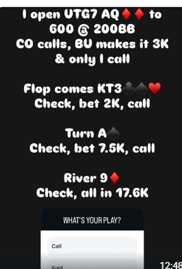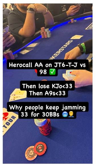 Jon’s first notable hand came when he was all-in with AT95♠️♥️♥️♠️ vs AA64♥️♦️♦️♠️ on KJ7♥️♦️♥️, but was unable to win.
