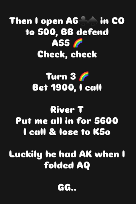 Then, in the 2nd bullet I busted AA65<AQJ8 all-in pre-flop.”