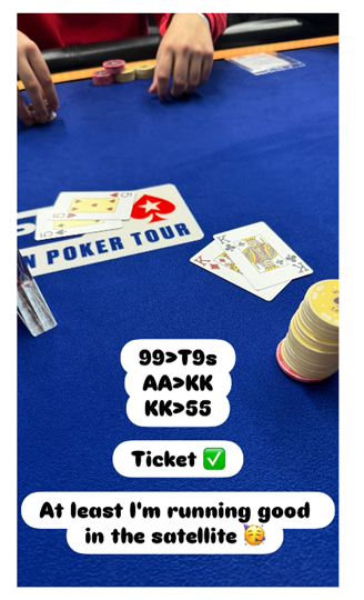I jumped into a €1155 Target satellite. You need to go from 10K to 50K to win a Main Event seat. After getting up to 47K three times, I finally got a ticket winning 44>AKs!”