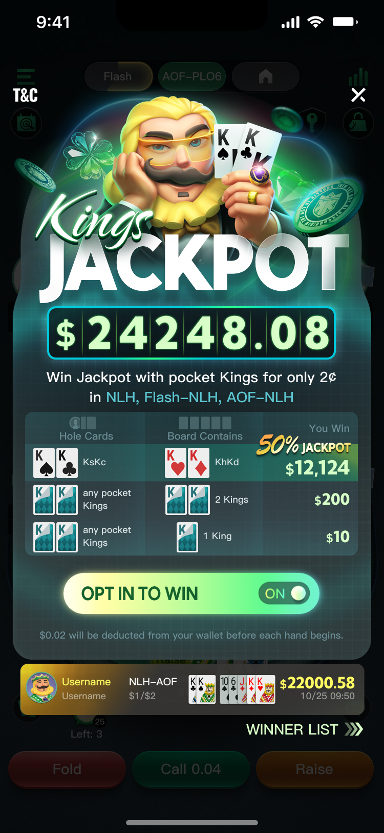 If no one wins the main Kings Jackpot by the end of the promotional event dates, the remaining prize pool will be evenly distributed among all players who have won any Kings Jackpot prize ($10 or $200).